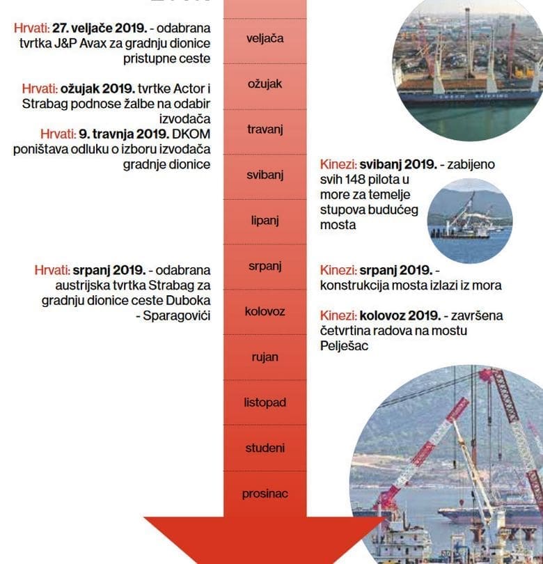 U tih 15 mjeseci kineska kompanija uspjela je potpisati ugovor, početi radove, u Kini izraditi 148 čeličnih cijevi promjera dva metra, brodovima ih dopremiti u Hrvatsku, zabiti sve te pilote u morsko dno, početi s izradom betonskih naglavnica na koje će se montirati stupovi mosta. Ukratko, u godinu dana od početka radova završili su četvrtinu predviđenog posla.