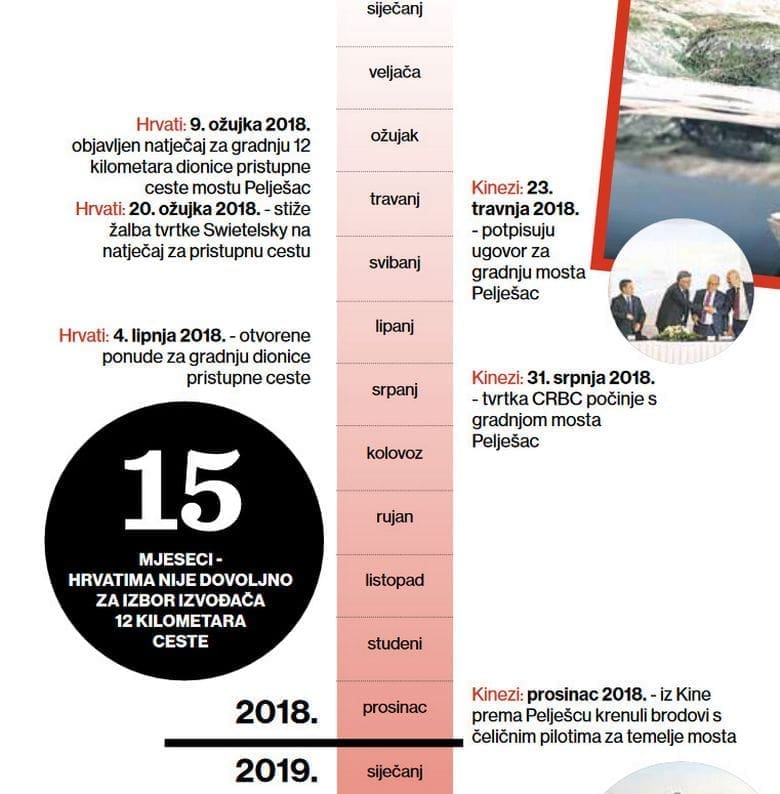 A Hrvati? Njima sve to vrijeme nije bilo dovoljno da odaberu izvođača radova za 12 kilometara dvotračne ceste. Kinezi su Hrvatima dali “fore” gotovo pet mjeseci. S radovima su počeli punih pet mjeseci nakon što su Hrvati raspisali natječaj. I opet su ih prestigli. Kinezi u godinu dana naprave četvrtinu mosta Pelješac, a Hrvati toliko vremena potroše da odaberu izvođača radova za 12 kilometara ceste.
