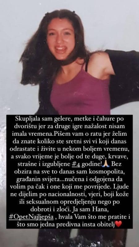 - Svako vrijeme je bolje od te duge, krvave, strašne i izgubljene četiri godine. Bez obzira na sve, ja sam kozmopolit, građanin svijeta... Naučena i odgojena da volim pa čak i one koji me povrijede. Ljude ne dijelim po nacionalnosti, vjeri, boji kože ili seksualnom opredijeljenu, nego po dobroti i zloći - zaključila je Hana na Instagramu koja se potom i zahvalila svojim pratiteljima na svoj podršci koju joj pružaju.