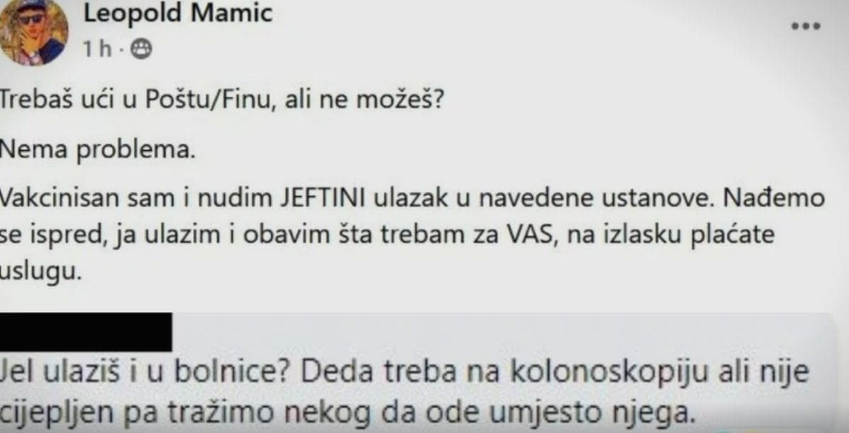 Vakcinisan sam i nudim JEFTINI ulazak u navedene ustanove. Nađemo se ispred, ja ulazim i obavim što trebam za VAS, na izlasku plaćate uslugu", piše u oglasu koji je objavio jutros. Apsolvent Međunarodnog poslovanja kaže da nije znao da će toliko eksplodirati.