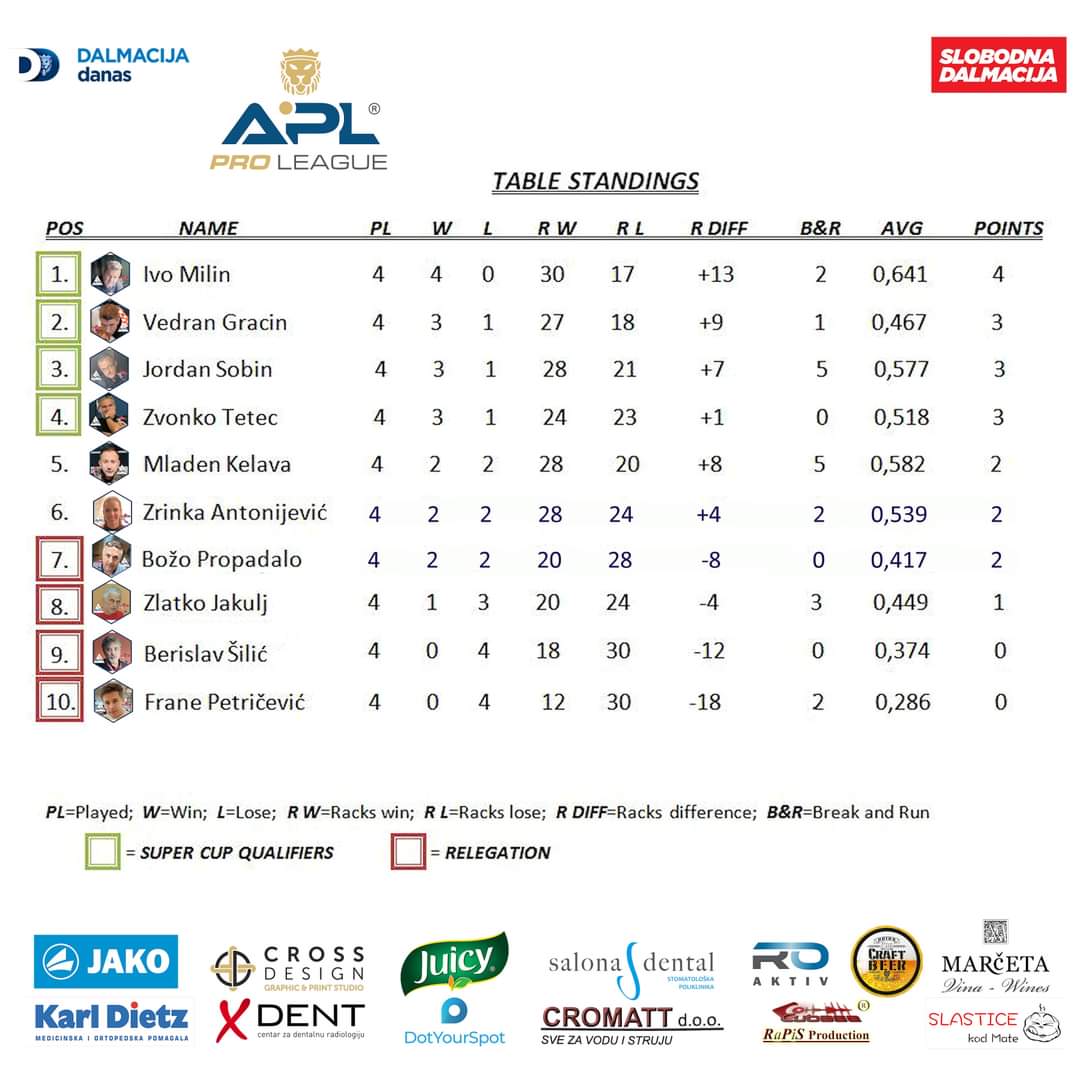 Poredak APL 10-Ball ' Cro Tour' vidljiv na tablici.