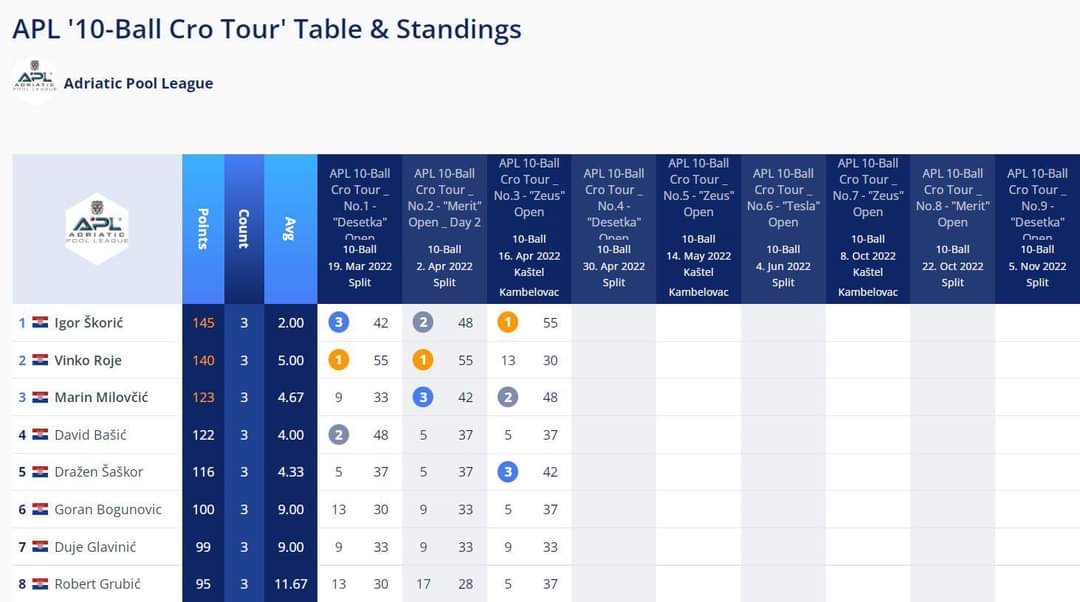 Poredak APL 10-Ball ' Cro Tour' vidljiv na tablici.