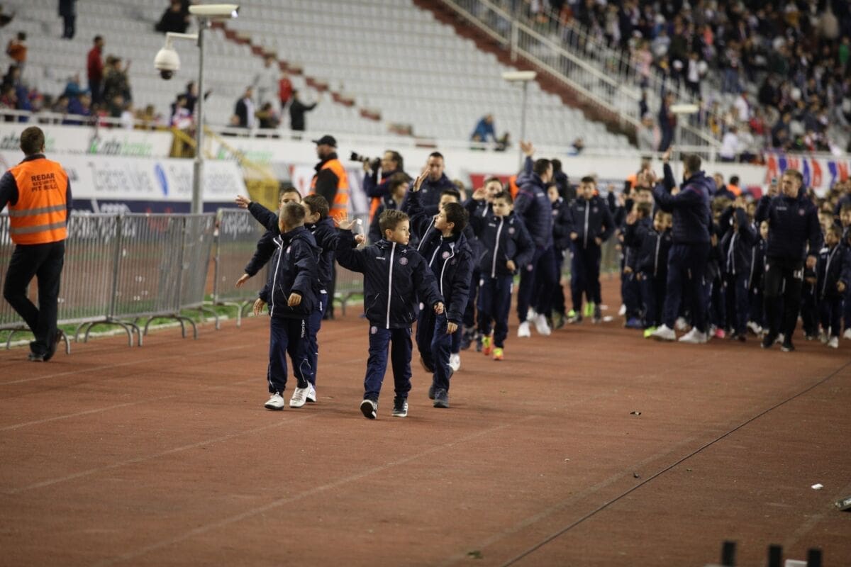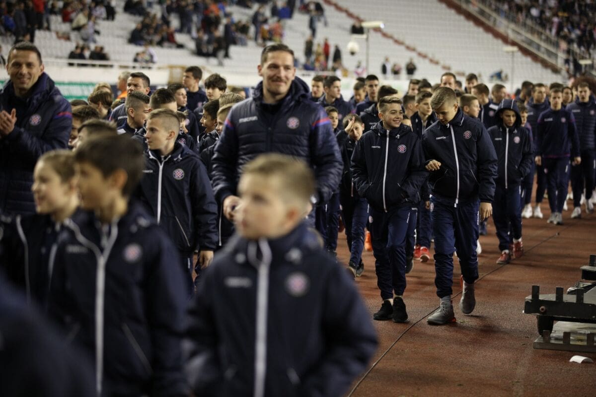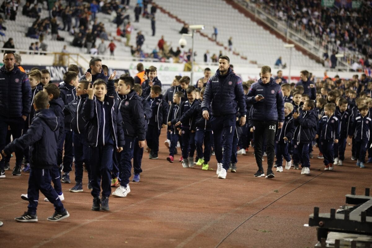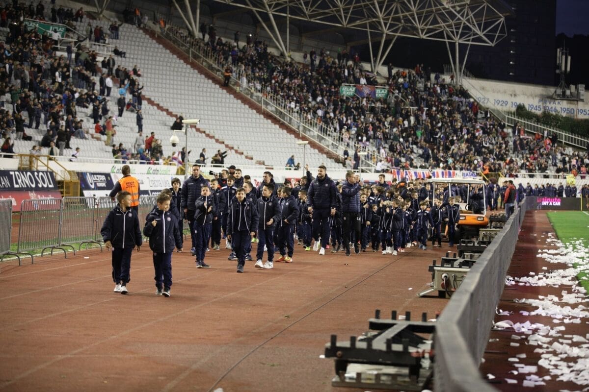 Hajduk na poluvremenu vodi protiv Rudeša 1:0, a tijekom stanke atletskom stazom prošetali su polaznici Hajdukove škole, koja je nedavno dobila naziv Akademija "Luka Kaliterna".