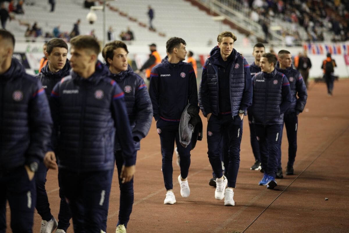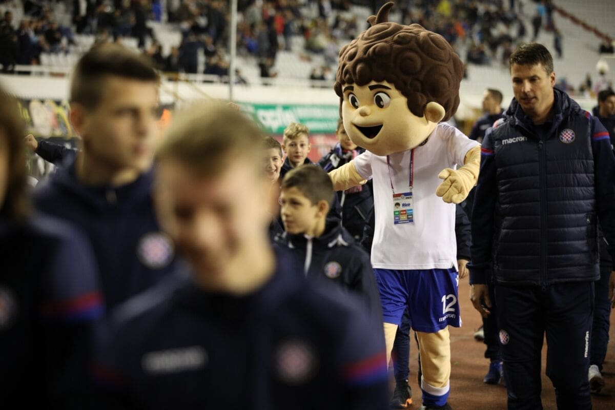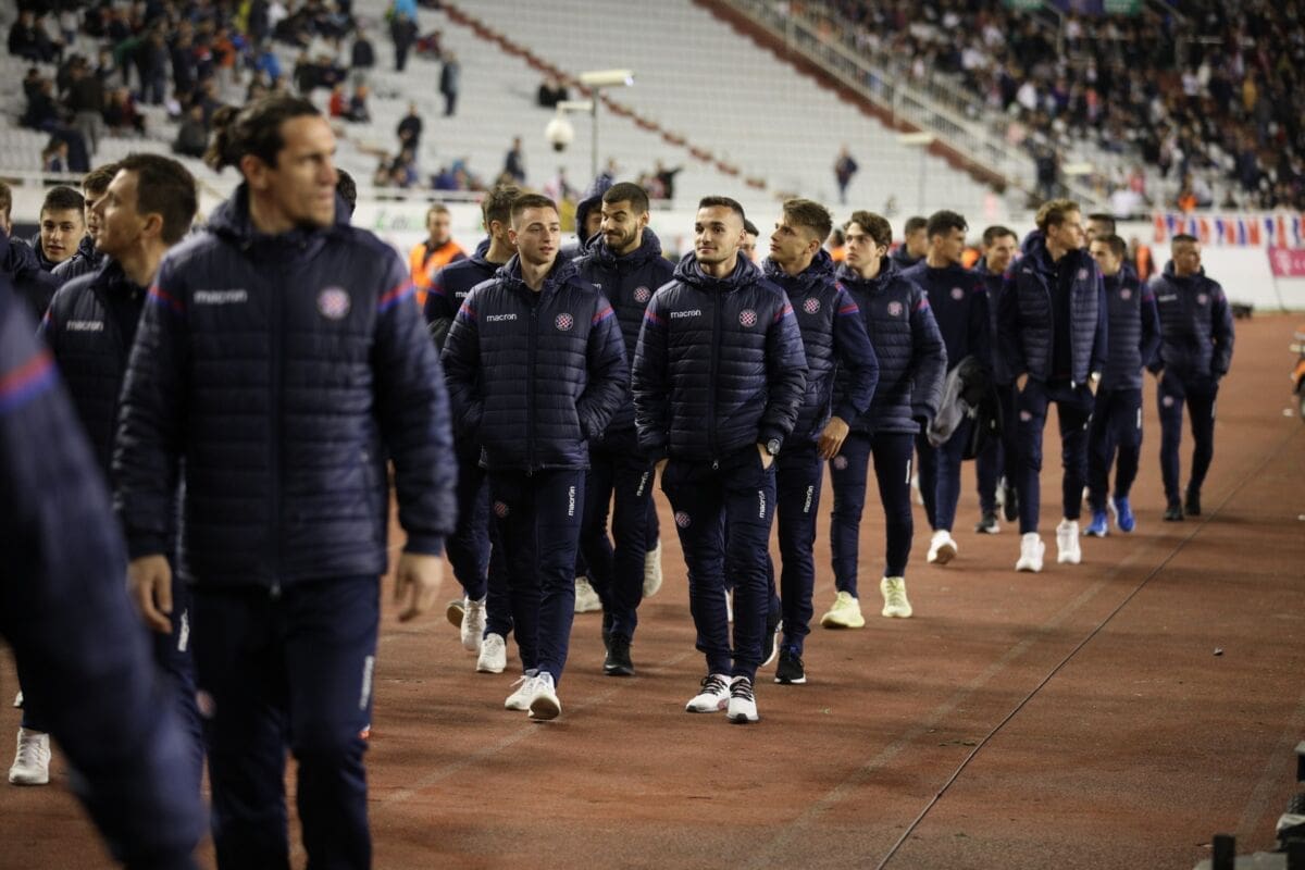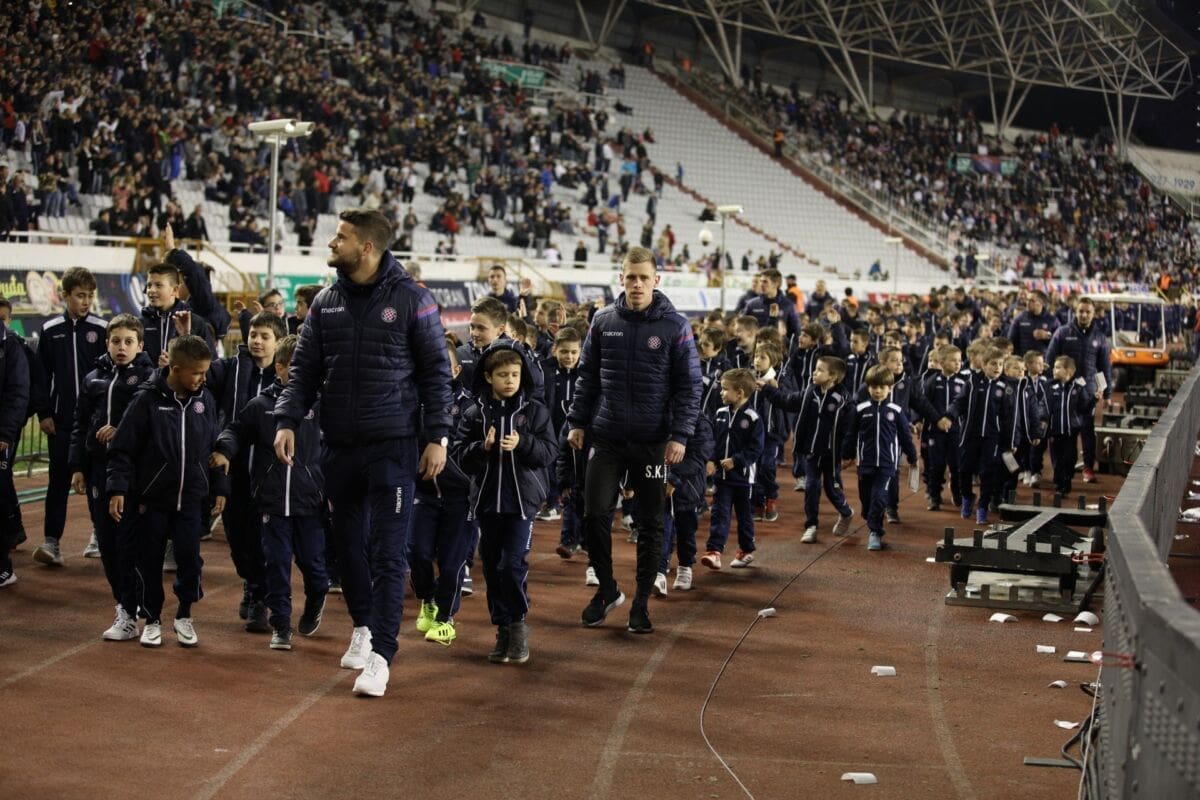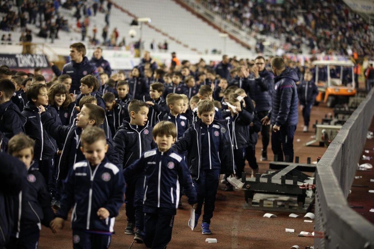 Hajduk na poluvremenu vodi protiv Rudeša 1:0, a tijekom stanke atletskom stazom prošetali su polaznici Hajdukove škole, koja je nedavno dobila naziv Akademija "Luka Kaliterna".