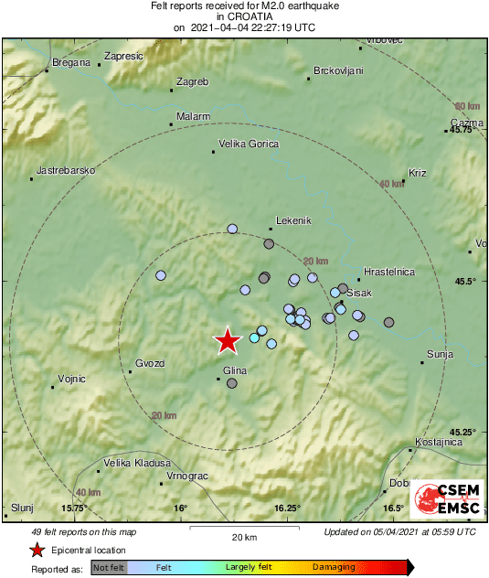 Epicentar potresa bio je 15 kilometara zapadno od Petrinje, a magnituda mu je bila 2.0 po Richteru.