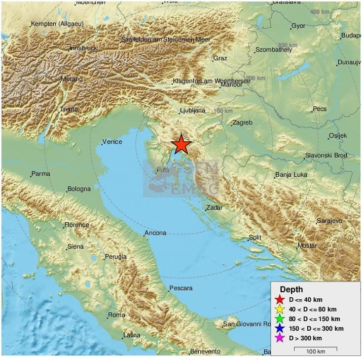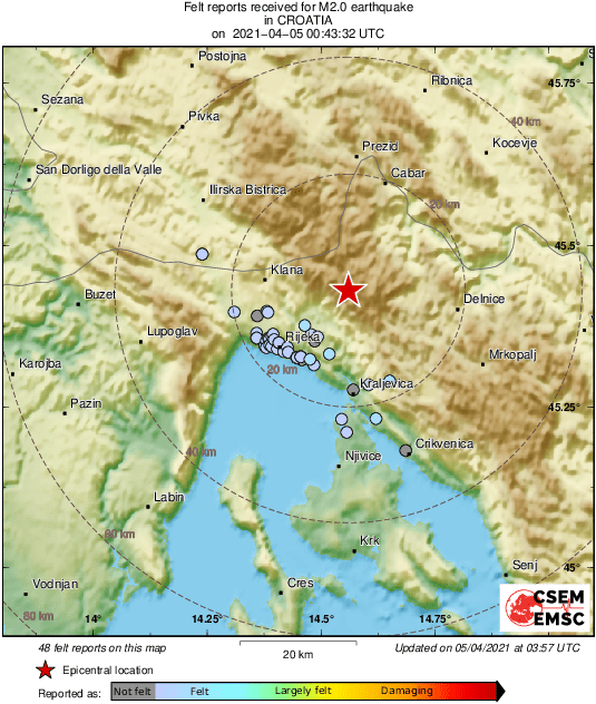 Prema podacima EMSC-a, magnituda potresa bila je 2.0 po Richteru, a epicentar je bio 15 kilometara sjeveroistočno od Rijeke.