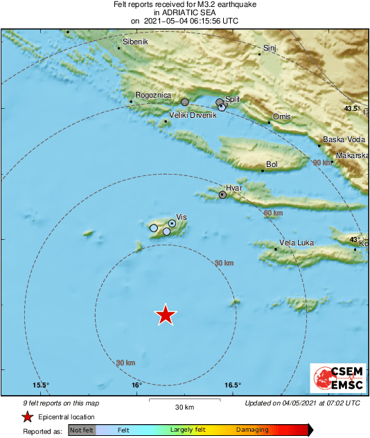 Prema podacima EMSC-a magnituda potresa iznosila je 3.2 stupnja prema Richterovoj ljestvici, a epicentar potresa bio je 39 kilometara južno od Visa i 92 kilometra južno od Splita.