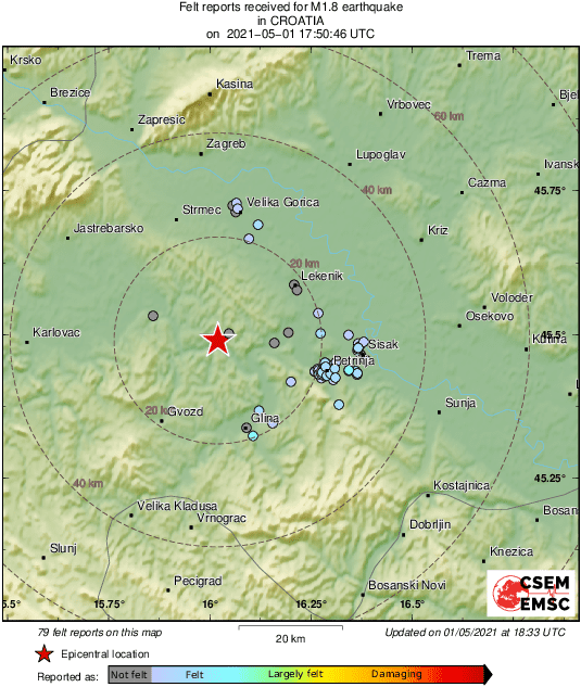 M1.8 #earthquake (#potres) strikes 28 km W of #Sisak (#Croatia) 12 min ago. Updated map of its effects: pic.twitter.com/PeJO66LUkT