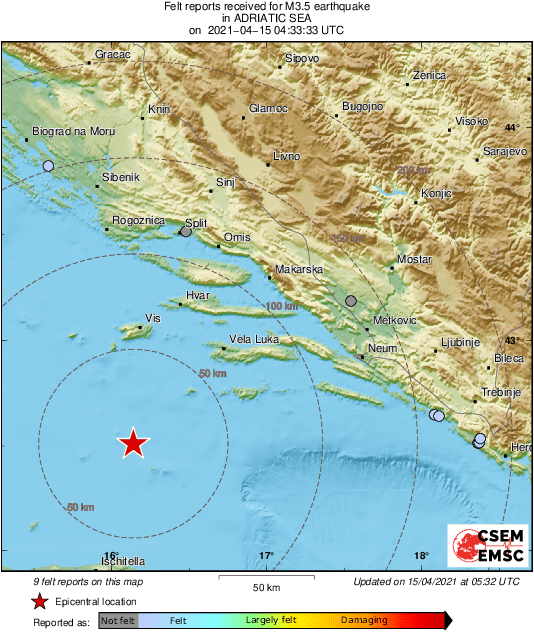 Prema podacima stranice EMSC magnituda potresa bila je 3.5 stupnjeva prema Richterovoj ljestvici, a epicentar mu je bio 64 kilometra sjeverno od talijanskog grada Peschici i 114 kilometara od južno od Splita.