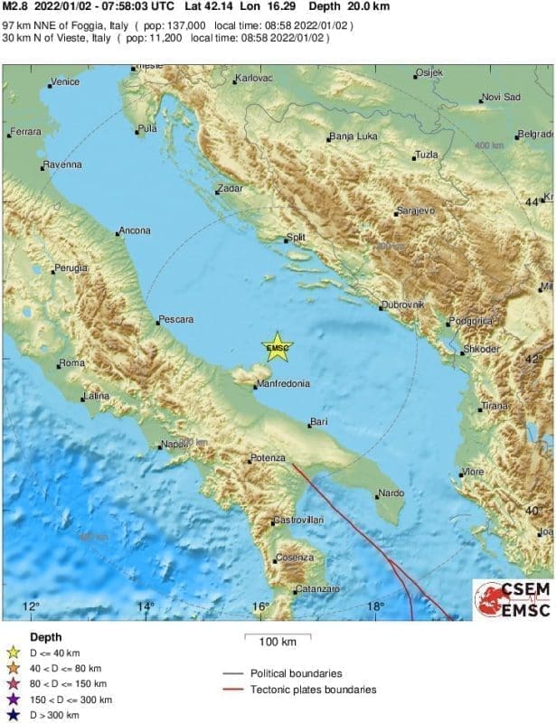 Prema podacima EMSC-a, magnituda mu je iznosila 2.8 prema Richteru, a epicentar je bio 30 kilometara sjeverno od talijanskog grada Vieste.