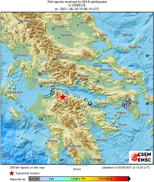M4.8 #earthquake (#σεισμός) strikes 28 km SE of #Pátra (#Greece) 16 min ago. Updated map of its effects: pic.twitter.com/emRIvVQzE5