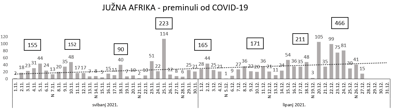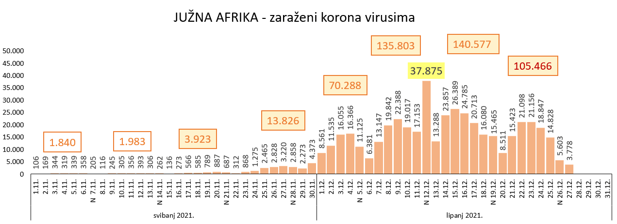 Zabilježeni broj zaraženih korona virusima u JAR dosegnuo je vrhunac 12.12. od kada slijedi smanjivanje broja zabilježenih korona pozitivnih (zaraženih kooronom).