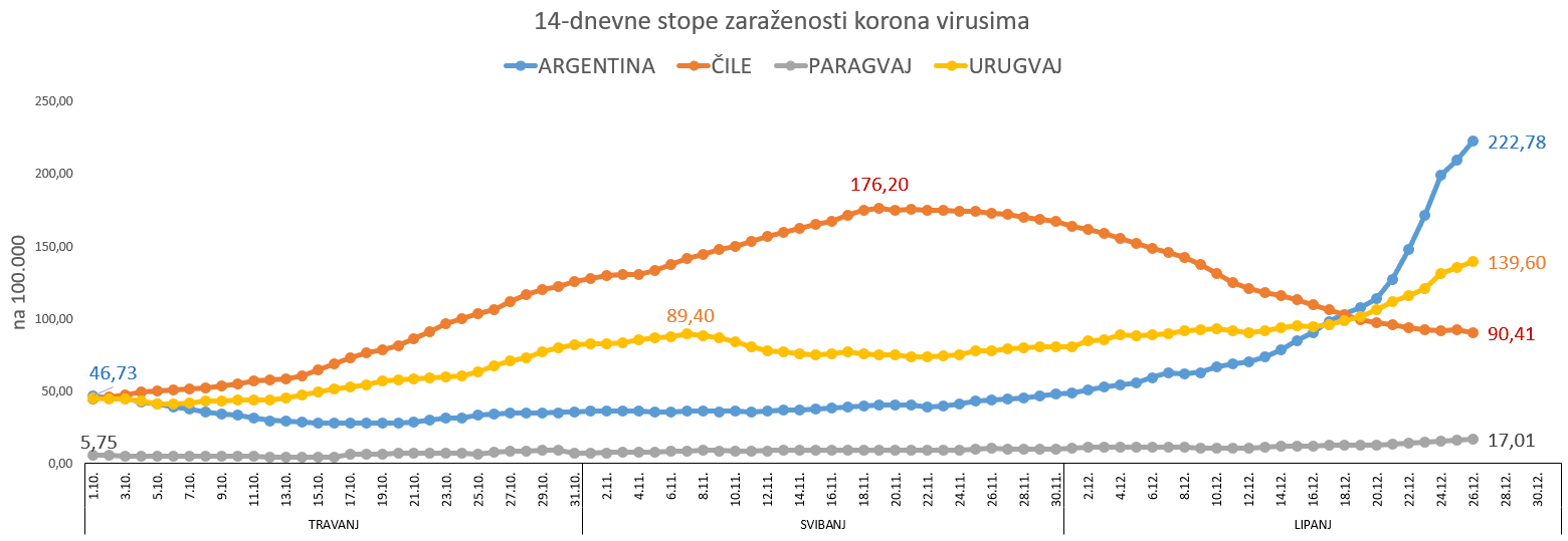Iza Argentine slijedi Urugvaj s povećanjem zaraženosti dok Čile ima trend smanjivanja stopa zaraženosti od polovice svibnja i sada je u uobičajenim stopama zaraženosti ljetnog razdoblja.