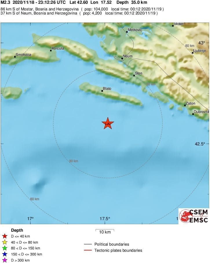 Prema podacima EMSC-a, magnituda mu je iznosila 2.3 po Richteru, a epicentar je bio 20 kilometara južno od otoka Mljeta.
