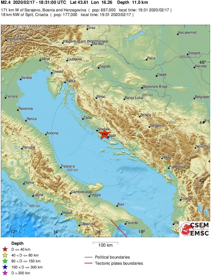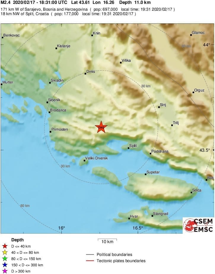 Prema podacima EMSC-a, koje još nije verificirao Seizmološki zavod RH, u ponedjeljak navečer u 19 sati i 31 minutu zabilježen je potres u srednjoj Dalmaciji.