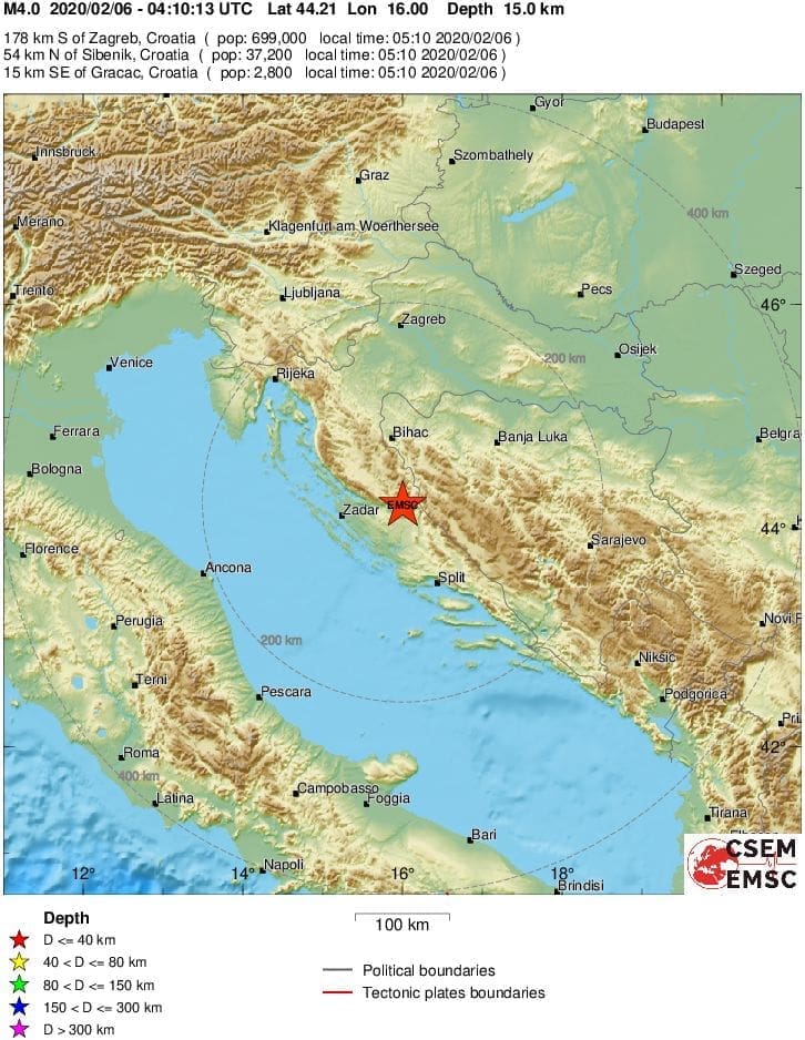 EMSC javlja da je zabilježen jak potres s epicentrom 54 kilometra zapadno od Šibenika, a magnituda mu je iznosila 4 po Richteru. Epicentar je bio na dubini od 15 kilometara.