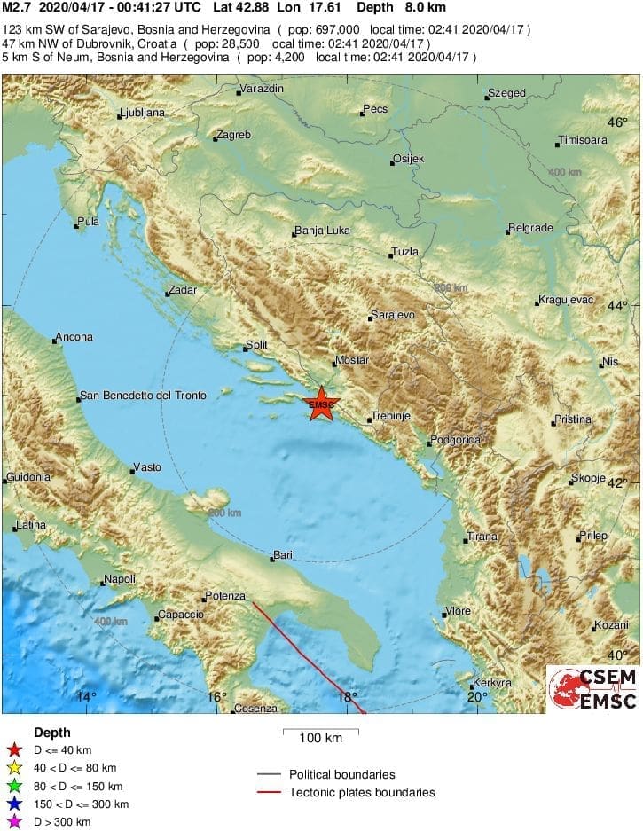 Osim u Zagrebu, krajem ožujka, 27.03. slab potres magnitude 2.6 pogodio je i Zadar. Potres magnitude 2.8 zatresao je Dubrovnik 29. ožujka, a jučer ujutro zabilježen je umjeren potres magnitude 3.5 prema Richteru s epicentrom kod Trebinja u Bosni i Hercegovini koji se osjetio na području Dubrovnika.