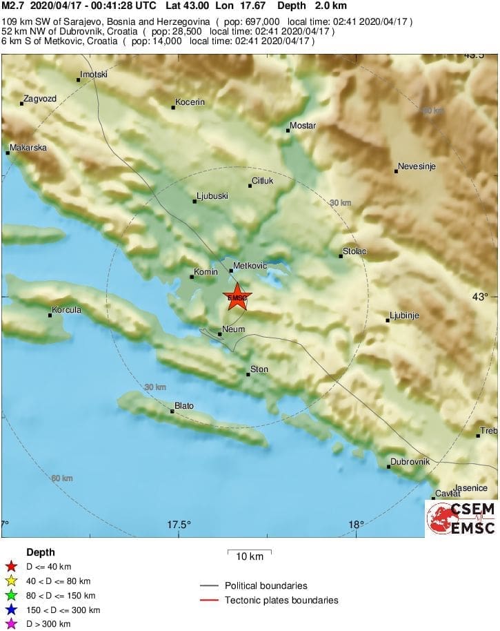 Hrvatska Seizmološka služba zabilježila je u petak umjeren potres magnitude 3.1 prema Richteru s epicentrom kod Metkovića.