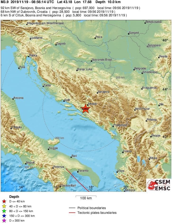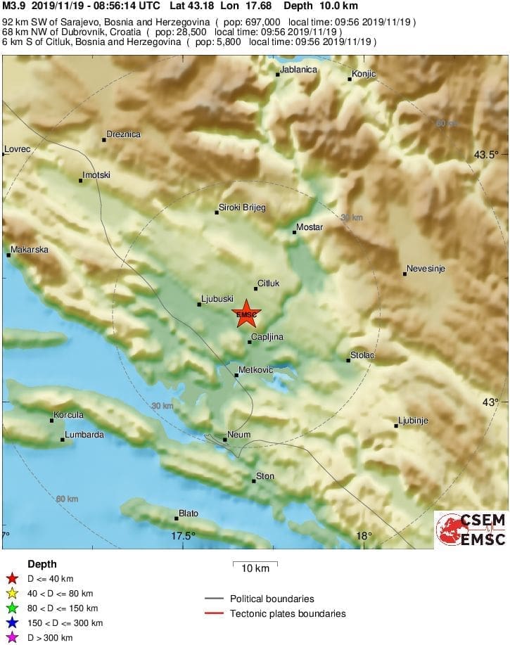 U 9 sati u 56 minuta dogodio se umjereno jak potres s epicentrom u susjednoj BiH. Prema preliminarnim podacima EMSC-a, epicentar potresa bio je magnitude 3.9 po Richteru, i to između Ljubuškog, Čitluka i Čapljine.