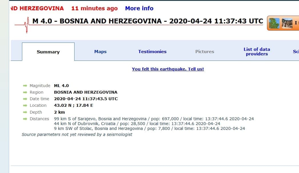 Prema prvim informacijama EMSC-a, epicentar potresa bilo je 9 kilometara jugozapadno od Stoca u BiH, 44 kilometra sjeverno od Dubrovnika. Magnituda potresa u epicentru procjenjuje se na 4,0 po Richteru. Prve procjene govore da se dogodio na dubini od 2 kilometra.