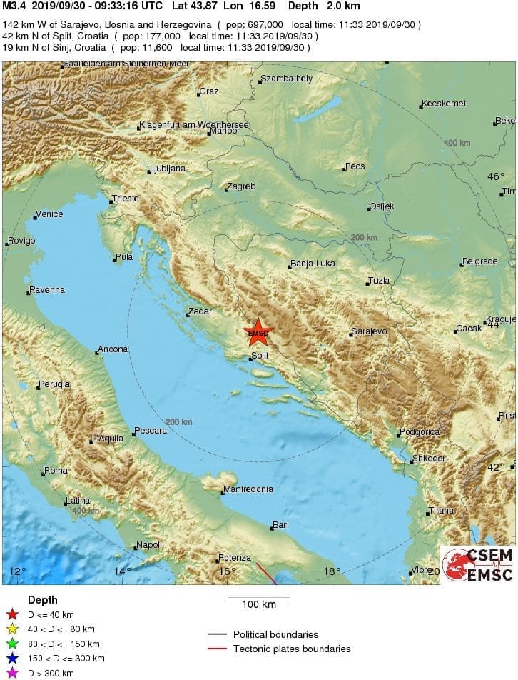 Danas, 30. rujna 2019. godine u 11:33 zabilježen je umjereno jak potres s epicentrom 19 kilometara sjeverno od Sinja, na Dinari. EMSC javlja da je potres bio magnitude 3,4 prema Richteru. Radi se o prvoj procjeni.