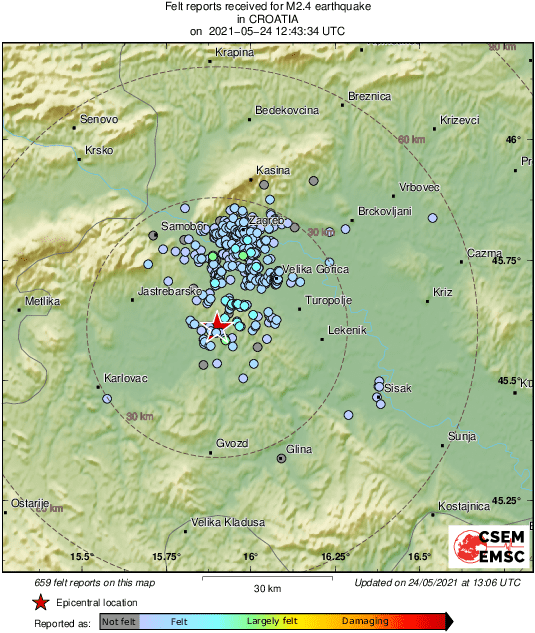 M2.4 #earthquake (#potres) strikes 23 km S of Zagreb - Centar (#Croatia) 13 min ago. Updated map of its effects: pic.twitter.com/CUhPtXg1bL