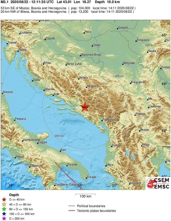 Potres se mogao osjetiti na jugu BiH, a slabo podrhtavanje zabilježeno je na širem dubrovačkom području.