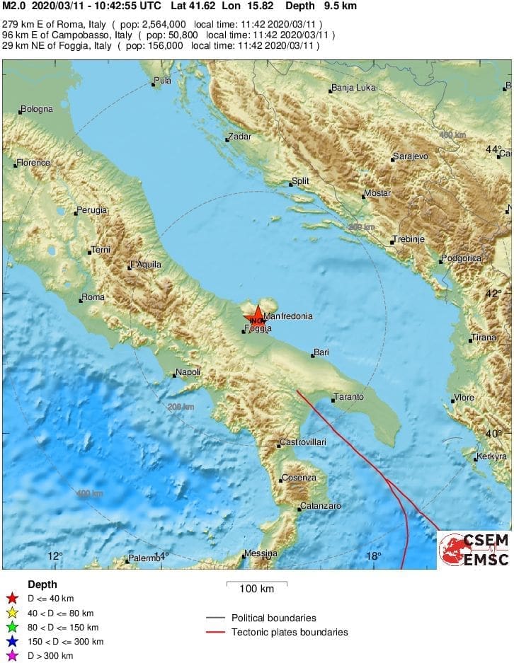Epicentar je bio 29 kilometara sjeveroistočno od Foggiae, nedaleko od Manfredonije na obali Jadranskog mora.