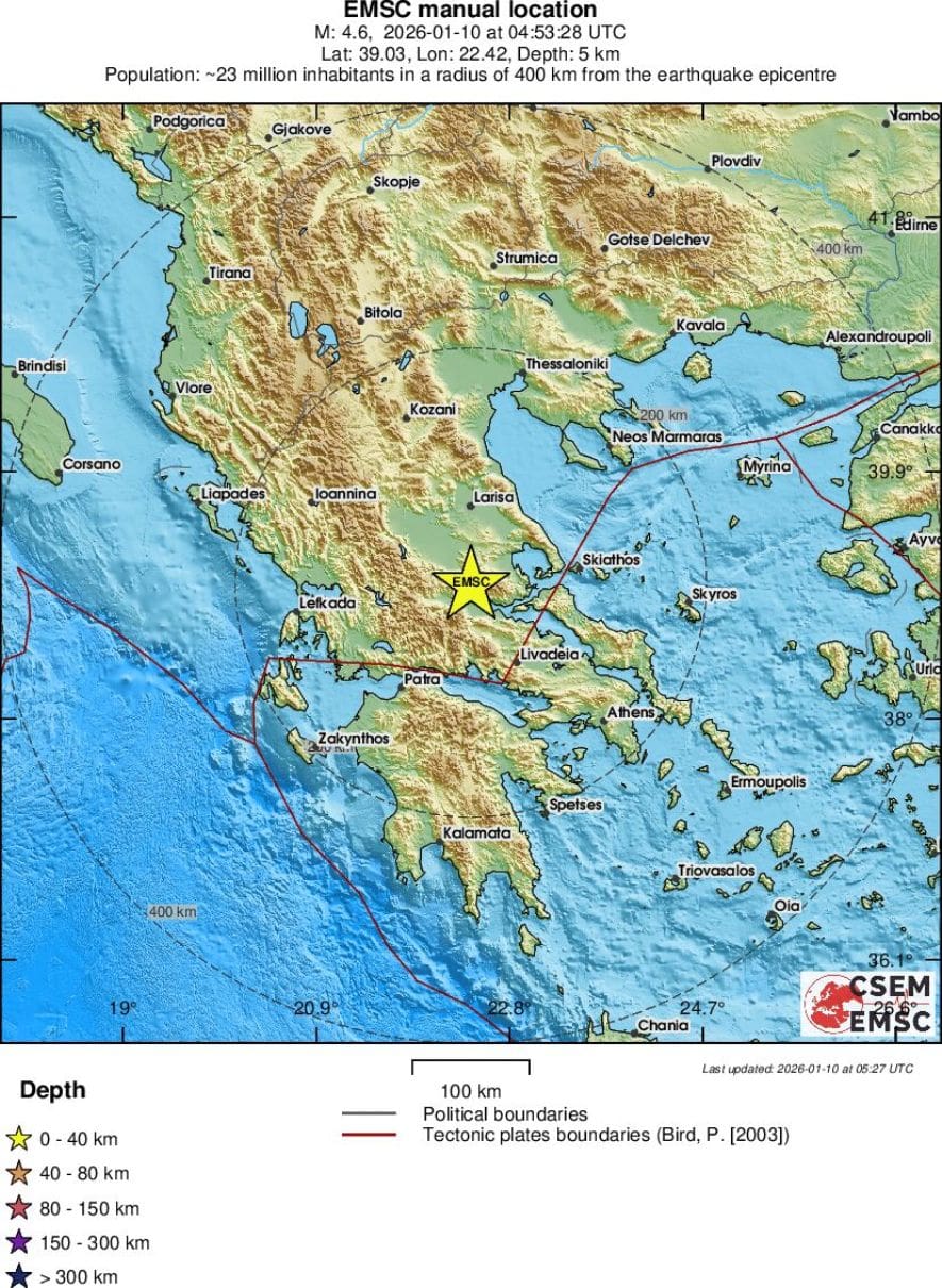 Potres magnitude 4,6 pogodio je središnju Grčku u petak, 10. siječnja 2026. u 6:53 sati po lokalnom vremenu, izvijestio je EMSC. Epicentar potresa je oko 67 kilometara južno od Larisae te 15 kilometara sjeverozapadno od Lamijae. Dubina potresa je 5 kilometara.