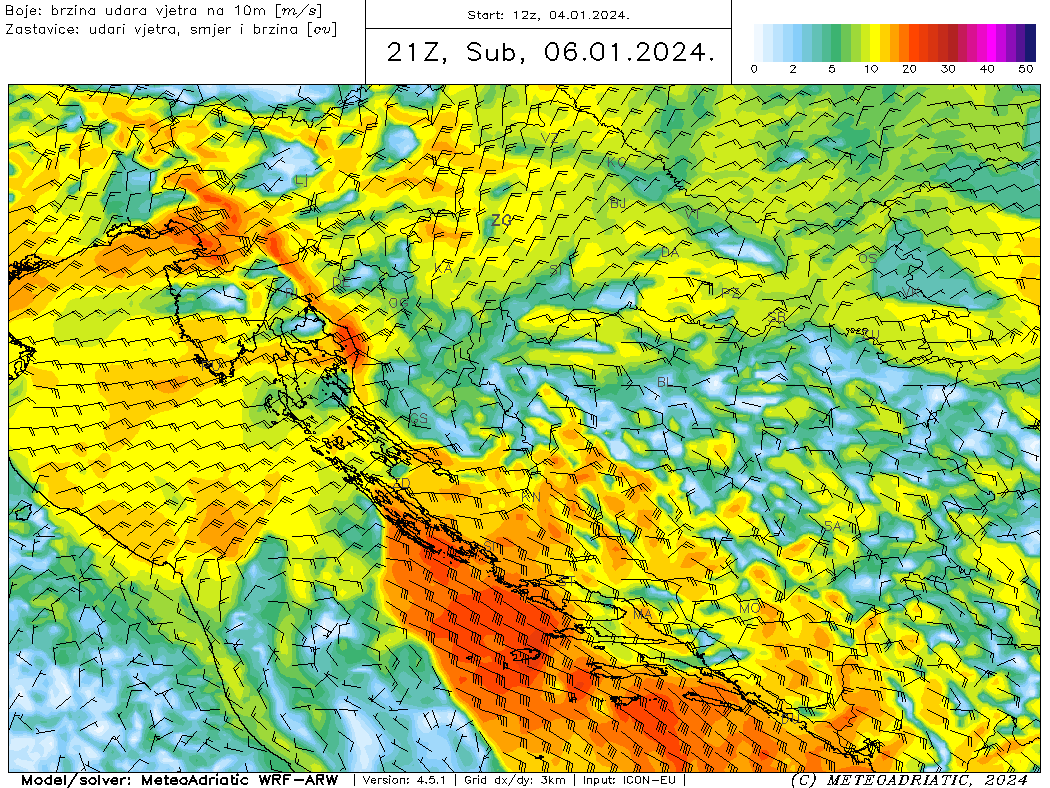 Subota će, pod direktnim ciklonalnim utjecajem, biti oblačna. Ujutro su moguća suha razdoblja, popodne i osobito navečer kiše, ponegdje i pljuskovi s grmljavinom. Lokalno će pasti preko 30 litara po metru kvadratnome. Puhat će jako jugo koje na moru može imati olujne udare preko 100 km/h. DHMZ je unutar sustava MeteoAlarm izdao narančasti stupanj upozorenja na moru zbog juga. Kasno navečer na krajnjem sjeveru Dalmacije i podno Velebita zapuhat će bura. Od jutra natprosječno toplo, a najviše dnevne temperature bit će od 12 do 17°C.