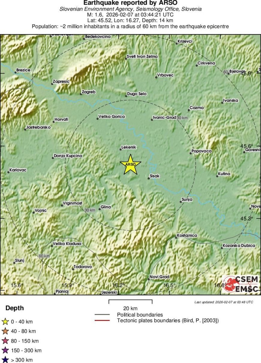 Tijekom večeri i noći na subotu, 7. veljače 2026., na području između Zagreba i Siska zabilježena su tri slaba potresa. Podrhtavanja su bila male magnitude i bez opasnosti za stanovništvo.