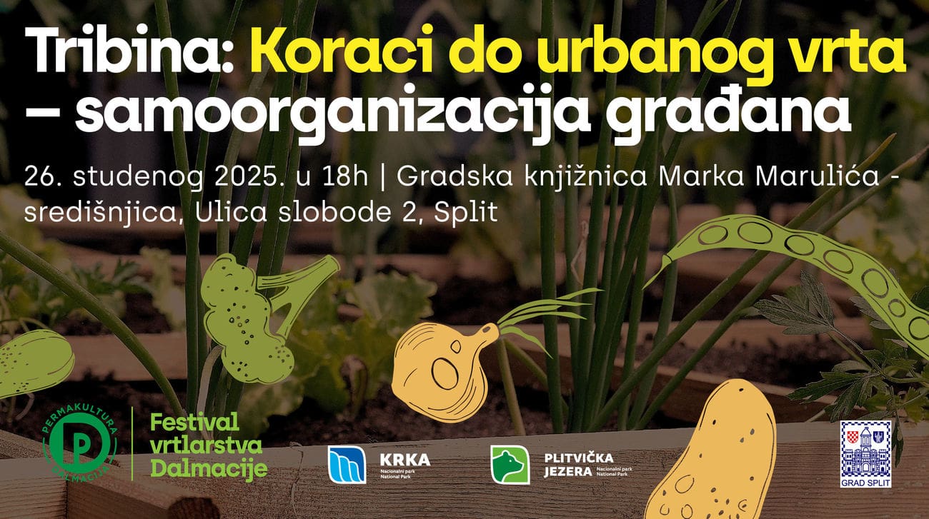 Udruga Permakultura Dalmacija, u suradnji s Gradskom knjižnicom Marka Marulića Split, poziva vas na tribinu „Koraci do urbanog vrta – samoorganizacija građana“, koja će se održati u srijedu, 26. studenoga 2025. u 18:00 sati, u dvorani Gradske knjižnice Marka Marulića.
