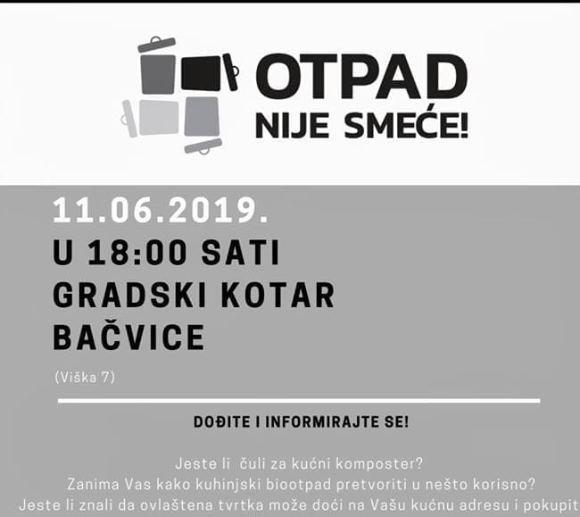 U sklopu projekta „Otpad nije smeće“ u utorak, 11. lipnja s početkom u 18 sati u prostorijama Gradskog kotara Bačvice (Viška 7) održat će se javna tribina na temu „Održivo gospodarenje otpadom“ koju provodi Udruga za prirodu, okoliš i održivi razvoj Sunce.
