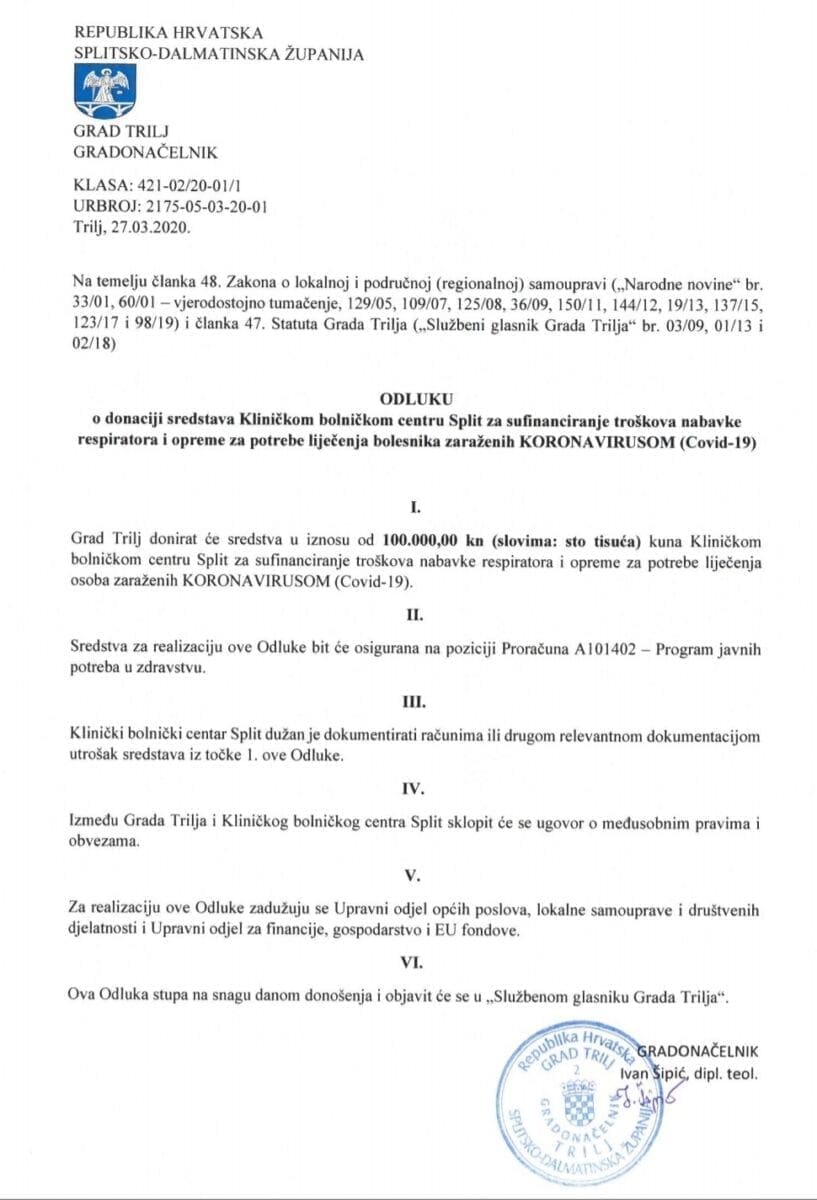 - Kao mnogi gradovi, općine i pojedinci i mi ćemo se odazvati. Grad Trilj će za tu namjenu izdvojiti 100 tisuća kuna i preusmjeriti ih prema KBC-u Split, kako bismo pomogli pri kupnji respiratora i druge opreme i potrepština koje su potrebne KBC-u da iznese ovaj teret koji je za sada pod kontrolom, ali ako eskalira bit će potrebno dosta sredstava i puno pomoći da se spase ljudski životi - kazao je Šipić.