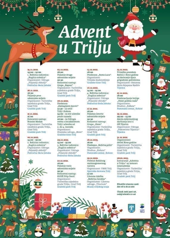 U organizaciji Turističke zajednice grada Trilja i Grada Trilja održat će se ''Advent u Trilju'' u vremenskom periodu od 25.11.2022. do 06.01.2023. u gradskom parku Trilj.