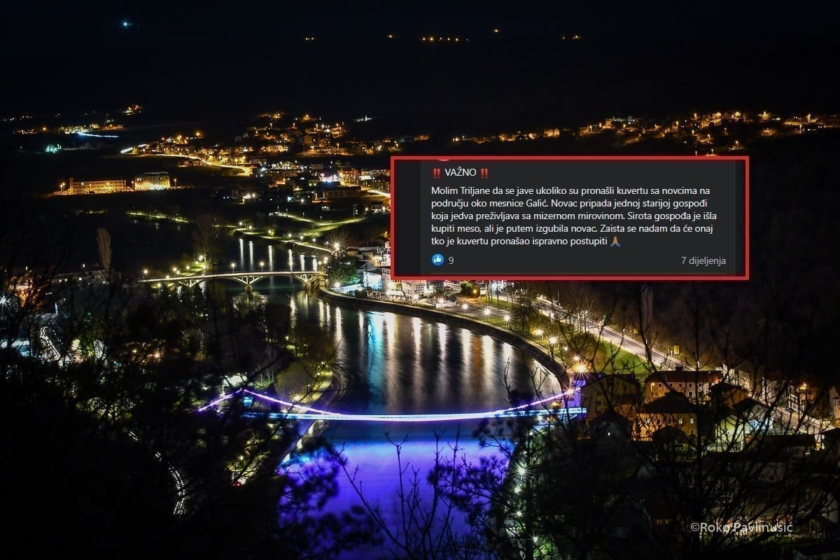- Molim Triljane da se jave ukoliko su pronašli kuvertu sa novcima na području oko mesnice Galić. Novac pripada jednoj starijoj gospođi koja jedva preživljava sa mizernom mirovinom. Sirota gospođa je išla kupiti meso, ali je putem izgubila novac. Zaista se nadam da će onaj tko je kuvertu pronašao ispravno postupiti - napisano je.