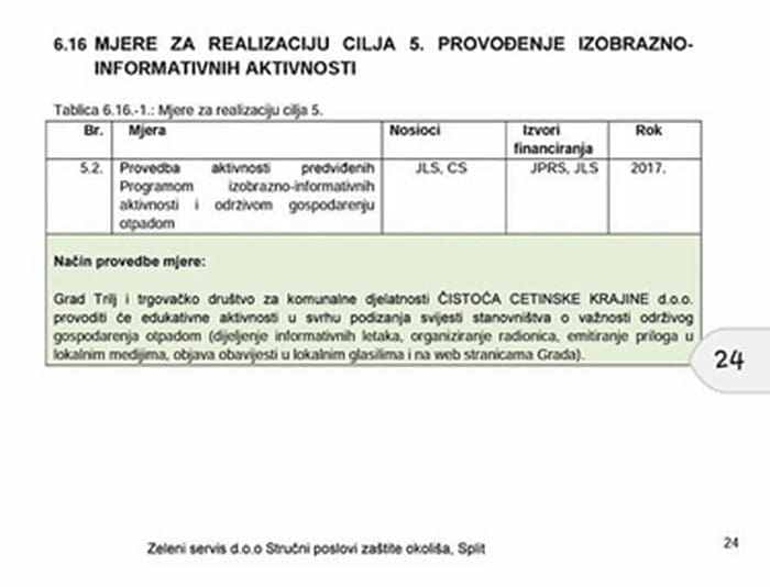 - Nije provedena edukativna aktivnost u svrhu podizanja svijesti stanovništva o važnosti održivog gospodarenja otpadom, koju su trebali održati Grad Trilj i trgovačko društvo za komunalne djelatnosti Čistoća Cetinske krajine. Rok za provedbu ove aktivnosti je bila 2017. godina.