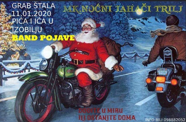 MK „Noćni jahači“ ponovno organizira humanitarni zimski moto susret koji će se održati ove subote, 11.01.2020. s početkom u 21 sat u Grabu pored Trilja, Štala, te Vas ovim putem pozivaju da im se pridružite u druženju uz bogat izbor jela i pića i dobru glazbu lokalne rock grupe „Pojave“.