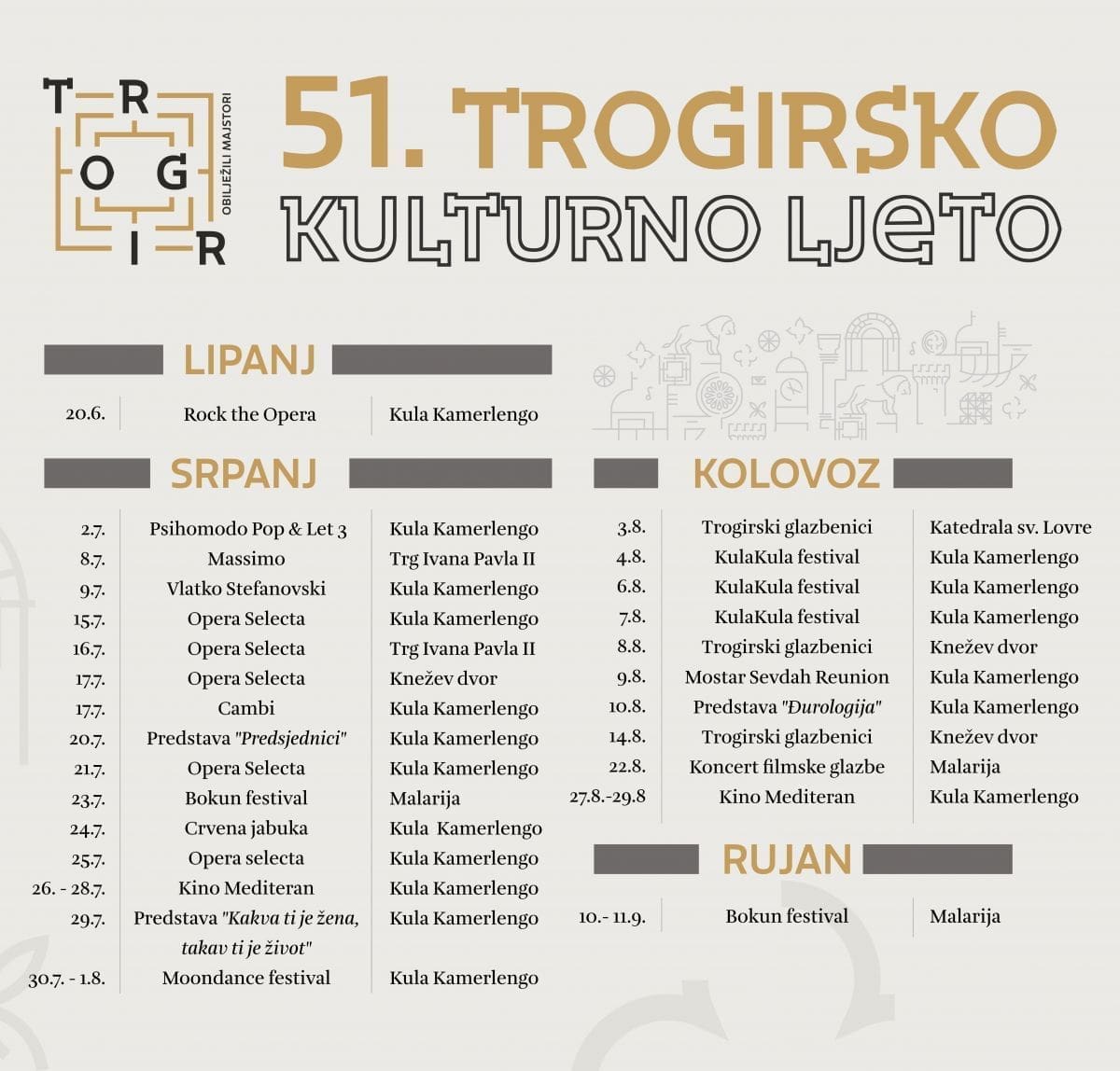 Događanja počinju već u nedjelju 20. lipnja spektaklom u Kuli Kamerlengo „Rock the Opera“ koji će ponuditi najveće rock hitove u izvedbi Zagrebačke filharmonije. Ekskluzivni je to događaj koji će se osim u Trogiru odviti na samo još dvije lokacije na obali. Za svečano otvaranje Ljeta 8. srpnja bit će zadužen Massimo, trenutno najpopularniji domaći glazbenik Porinom nagrađen za hit godine koji će održati koncert na glavnom gradskom trgu. Opera Selecta, jedinstveni kulturni festival i brend trogirskog ljeta u srpnju doživljava svoje 13. izdanje te ove godine uz operne izvedbe u Trogir dovodi i modnu reviju. Još jedan festival koji postaje tradicija je KulaKula koji će ove godine doživjeti svoje četvrto izdanje 4., 6. i 7. kolovoza. Povratak doživljava i popularni festival elektronske glazbe Moondance (30.7-1.8.). Trogirane i njihove goste zabavljat će Let 3 i Psihomodo Pop (2.7.), Vlatko Stefanovski (9.7.), Cambi (17.7.), Crvena Jabuka (24.7.), Mostar Sevdah Reunion (9.8.)... Tu su, među ostalim, još i tri predstave – Đurologija, Predsjednica i Kakva ti je žena, takav ti je život.