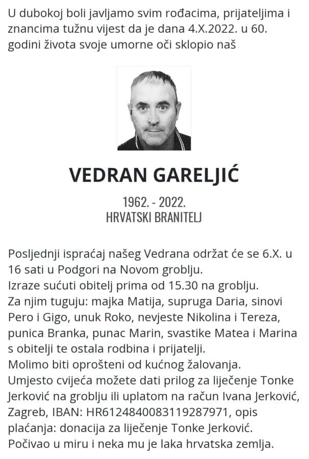 "Umjesto cvijeća možete dati prilog za liječenje Tonke Jerković na groblju ili uplatom na račun Ivana Jerković, Zagreb, IBAN HR6124840083119287971, opis plaćanja: donacija za liječenje Tonke Jerković", piše u osmrtnici.