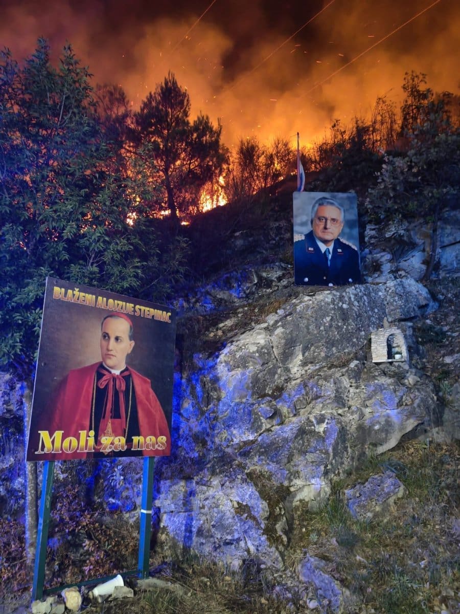 Vatrogasci su napravili frontu na cesti i paze da se vatra ne prebaci s druge strane, a zasada im čuvanje ide vrlo uspješno pa su čak uspjeli spasiti plakat Tuđmana i Stepinca.