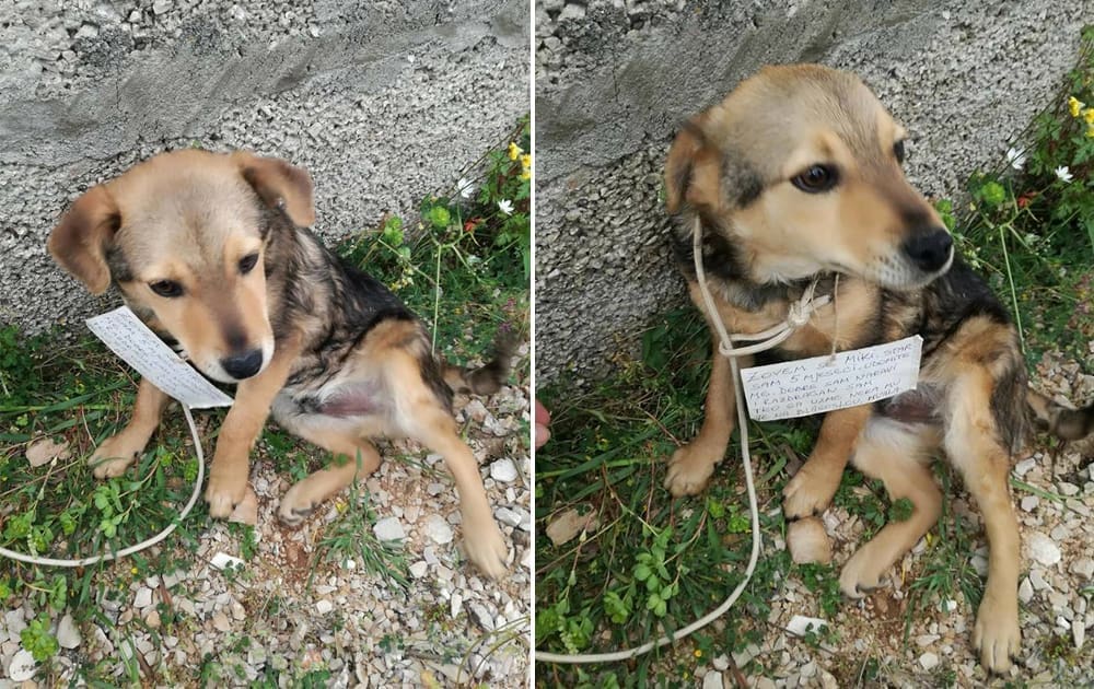 Na stranicama udruge Šibenske šape objavljene su fotografije psića kojeg je netko ostavio vezanog za ogradu u Primoštenu s porukom oko vrata: