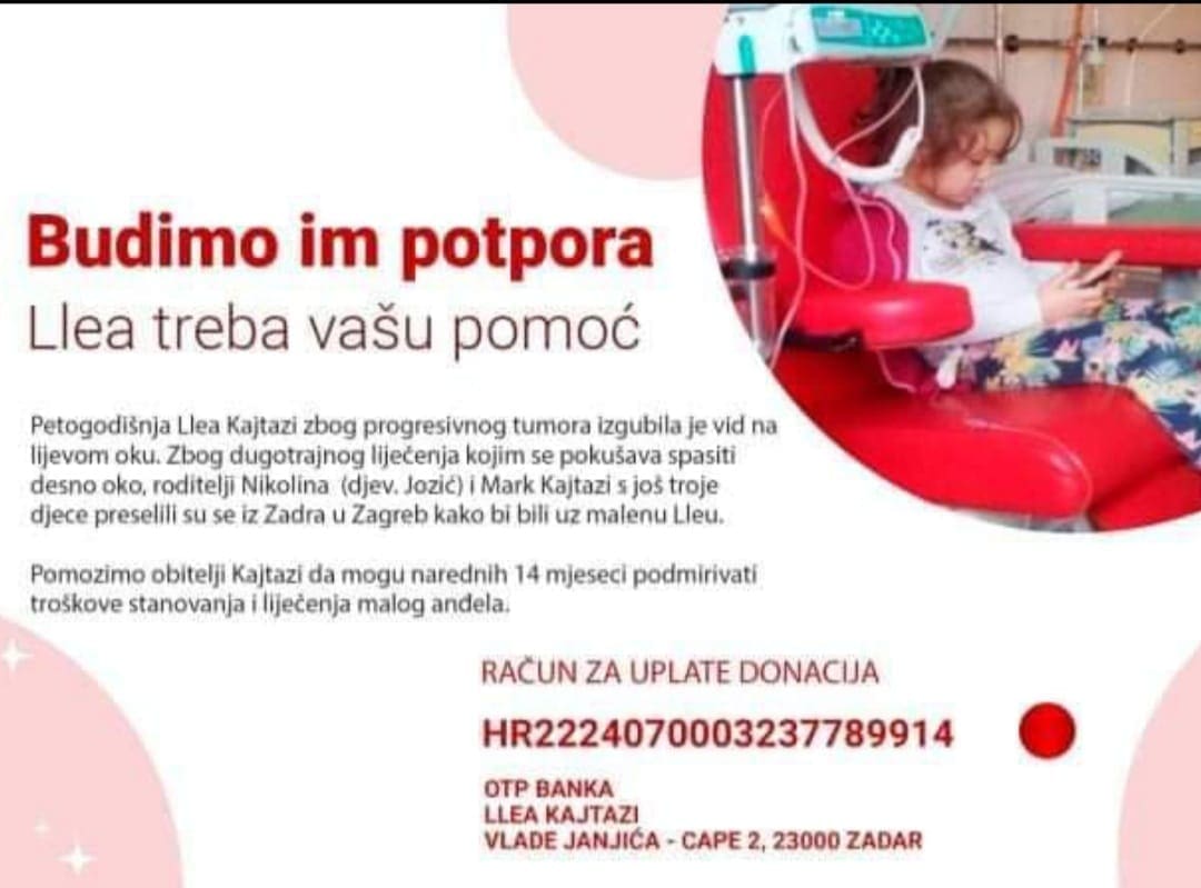 Lea Kajtazi ima samo šest godina. Prije godinu i pol oboljela je od tumora koji je zahvatio očne živce. Svake srijede, a katkad i češće, iz Zadra na liječenje putuje u Zagreb - gdje su živjeli do prije nekoliko mjeseci. Iz Zagreba su morali otići jer stan nemaju, a obitelj s petero djece teško pronalazi ikakav smještaj. Težak teret za Leu i njezinu obitelj, javlja HTV.