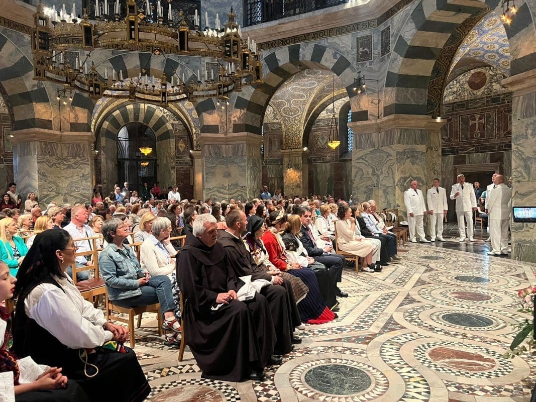 Večeras su se Hrvati koji borave u SR Njemačkoj i Saveznoj zemlji Sjevernoj Rajni Vestfaliji prvi puta u povijesti okupili u Dvorskoj kapeli onodobnog širitelja kršćanstva, kršćanstva kojeg smo i mi Hrvati prihvatili od franačkih misionara, dakle Karlovih misionara. Imao sam prigode čuti da se Sveta Misa u Aachenskoj katedrali nikada i nije slavila na bilo kojem od stranih jezika, a evo večeras smo je proslavili na hrvatskom jeziku.