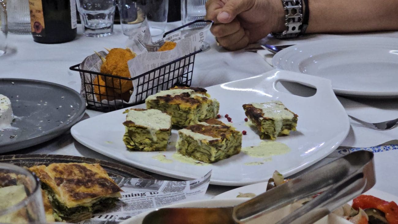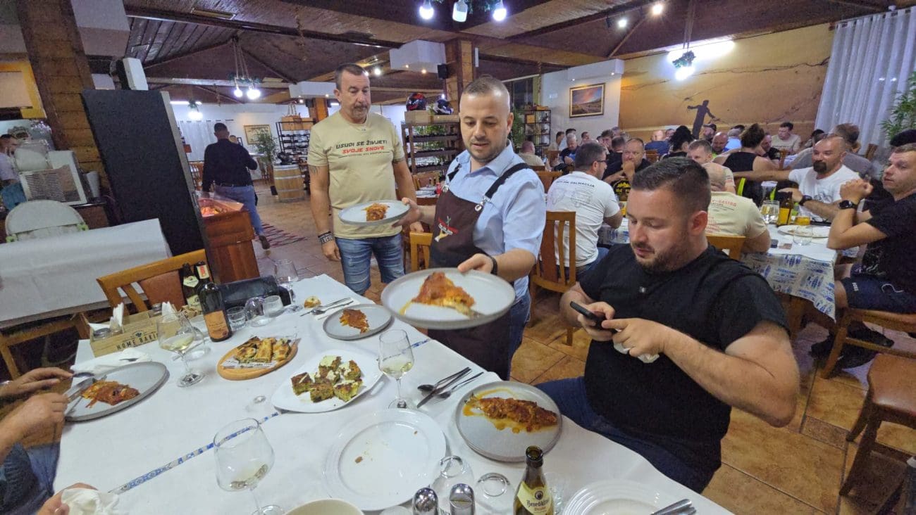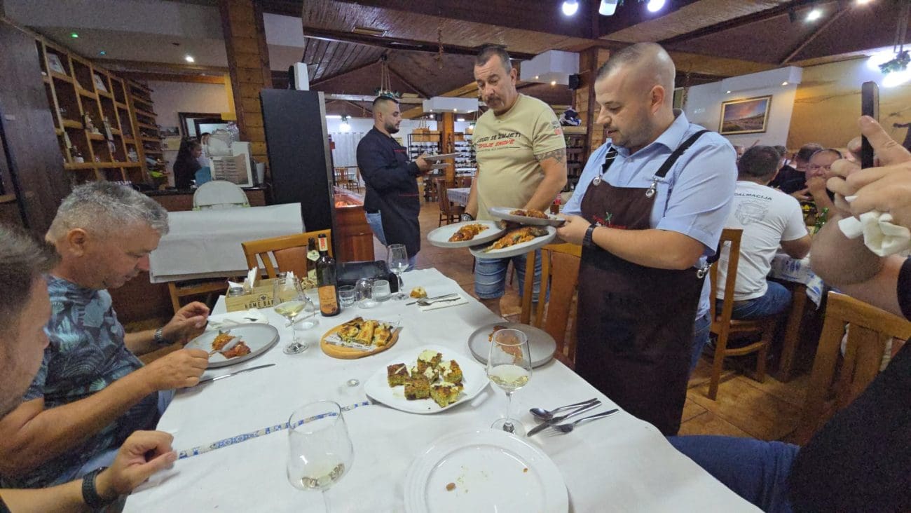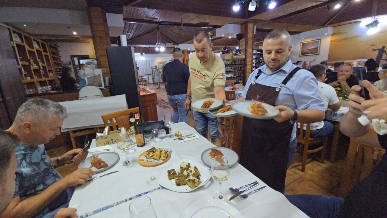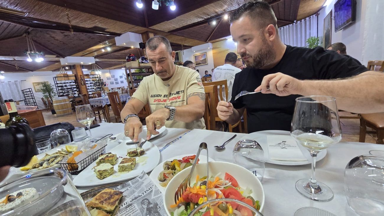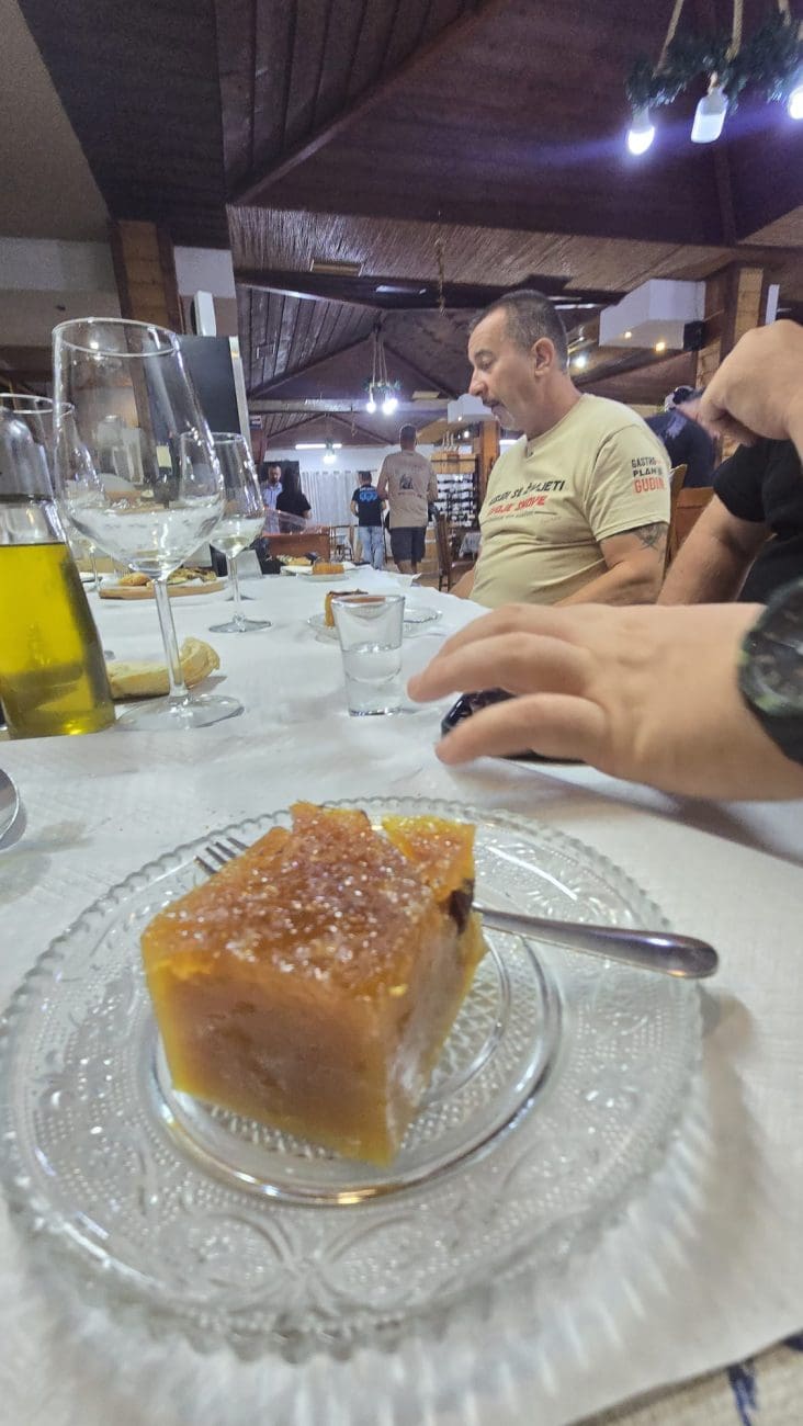 Ovoga puta večera je bila s ribljeg menija, iako je već u predjelu, odnosno mezi, bilo i mesnih proizvoda. Kušali smo kotlete s pohanim rakom, frigane inćune, burek, kruh sa zeljem i koprom. Glavno jelo bio je lešani brancin u “starinskoj” šalši. Pili smo izvrsna albanska bijela vina i uživali u večeri koja je, nakon lošeg iskustva u Grčkoj, bila prava “likarija”. Bez sumnje, spada u top tri večere našeg putovanja – odmah iza nenadmašnih Makedonaca.
