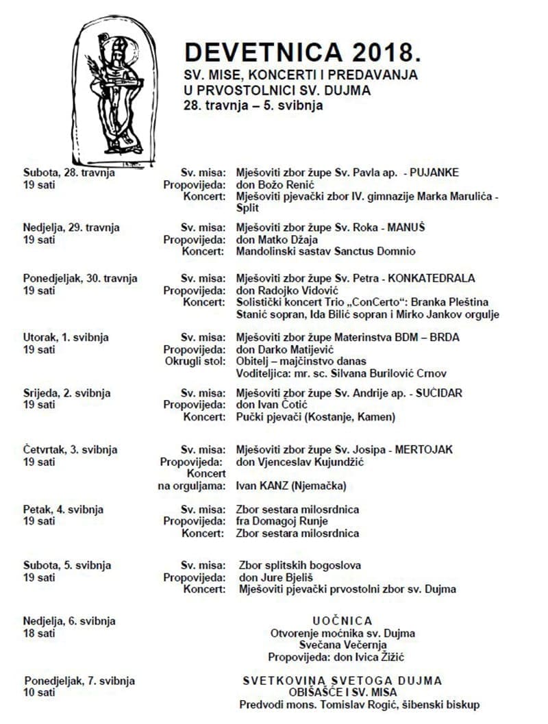 U nedjelju, 6. svibnja, u 18 sati u katedrali je otvaranje moćnika zaštitnika sv. Dujma nakon čega slijedi svečana Večernja s prigodnom meditacijom don Ivice Žižića.