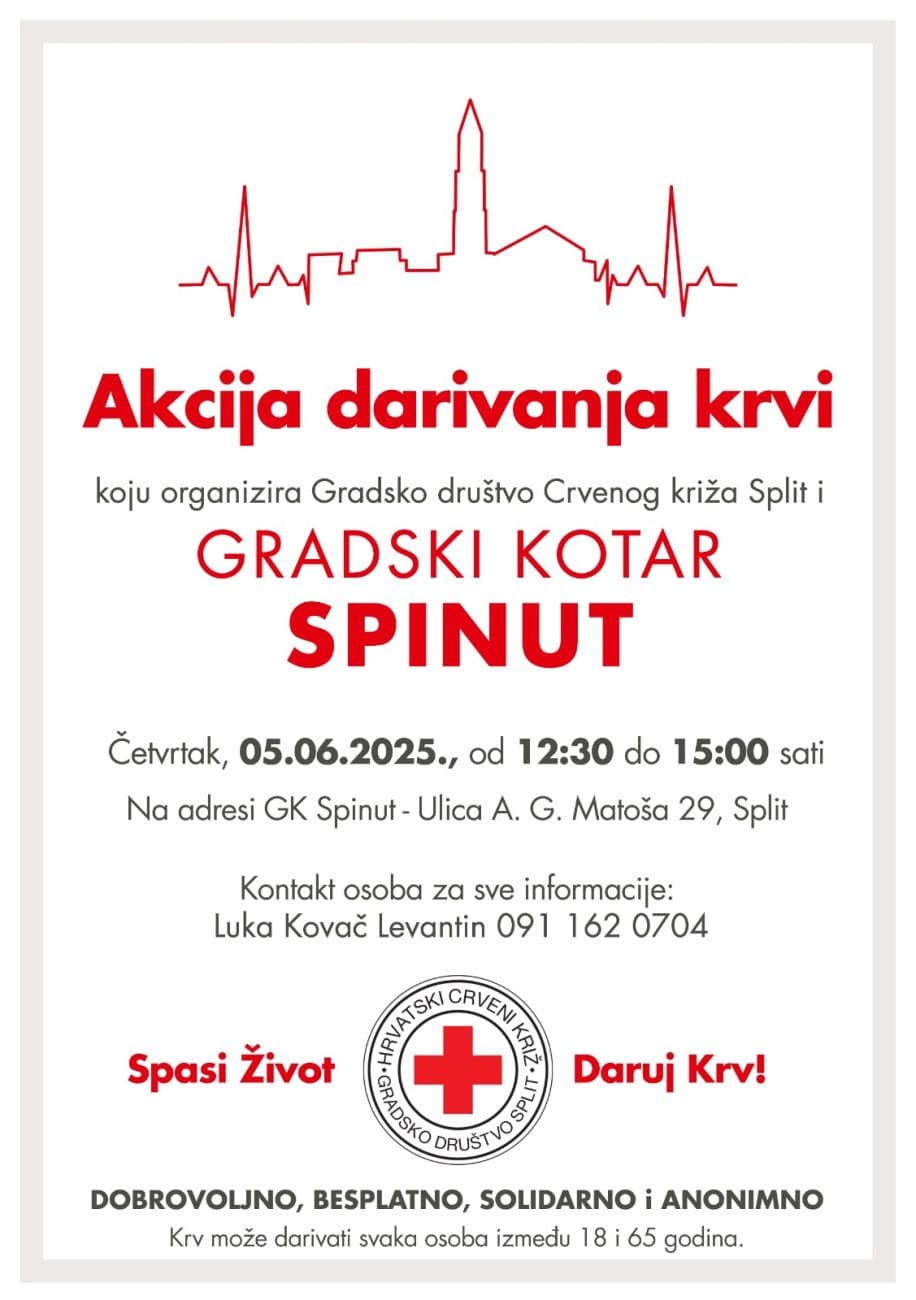 Nakon što je prva akcija darivanja krvi u splitskom kvartu Spinut privukla više od 50 dobrovoljaca, Gradski kotar Spinut u suradnji s KBC-om Firule i Crvenim križem Split organizira novu akciju dobrovoljnog darivanja krvi.