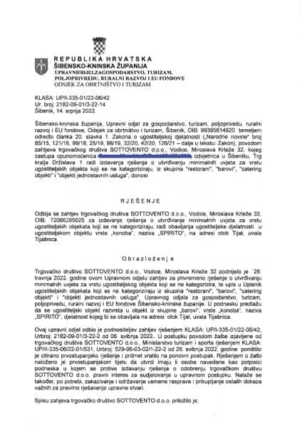 Nakon pet godina profitabilnog poslovanja, 17.srpnja 2022. godine županija Šibensko - kninska i njen Odsjek za obrtništvo i turizam odbilo je dati novo rješenje o utvrđivanju minimalno - tehničkih uvjeta za "konobu" Spirito.