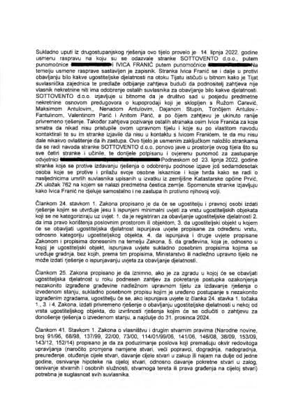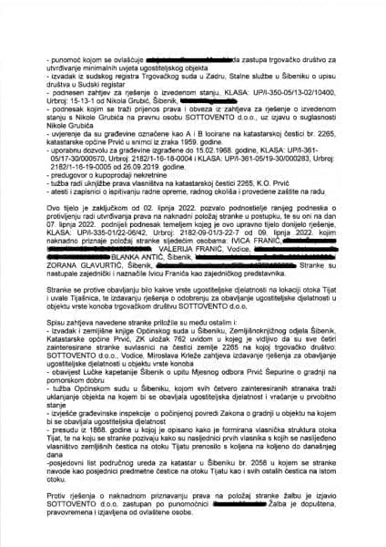 Nenad Antulov i drugi pokrenuli su sudski postupak: - P-319/2022 od 10.02.2022.u kojem tuže 172 suvlasnika od 534 upisana suvlasnika (a realno ih je danas barem 3 puta više, jer su mnogi pokojni, a mnoga rješenja o naslijeđivanju još nisu provedena, što se vidi i iz samog dokumenta). Kad se pokrene sudski postupak svih 172, a vjerovatno i mnogo više suvlasnika aktivno će braniti svoja prava. I konačno 14.04.2022. isti akteri ( Nenad Antulov, Maksim Antulov, Dajana Stupin, Tonči Antulov-Fantulin, Vera Grubelić, Ruža Carević, te Anita i Valentina Parić) potpisuju PREDUGOVOR o prodaji č.z.2265 za cijelo tvrki Sottovento I taj ugovor suvlasnici smatraju nezakonitim i nevaljanim, jer su samovoljno, bez znanja drugih suvlasnika potpisali predugovor o kupoprodaji nekretnine č.z.2265 , a da prethodno nisu ostvarili niti dokazali da su vlasnici iste. Isti ugovor suvlasnici doživljavaju kao „pravni manevar“ u ostvarivnju prava za ishodovanje privremenog rješenja za MTU (minimalni tehnički uvjeti). Suvlasnici (upisani u zemljišne knjige i oni vanknjižni) se u cijelosti protive svim stavkama predugovora o kupoprodaji nekretnine č.z.2265. tvrtki Sottovento, pa su i potpisali izjavu o protivljenju izdavanja rješenja za MTU 23.06.2022. (70 potpisa suvlasnika uglavnom starijih od 70 godina komplet s fotografijom osobne).