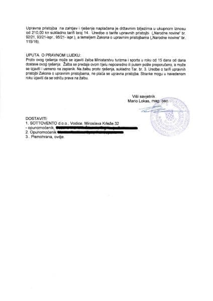 "Turistička inspekcija Državnog inspektorata obavila je inspekcijski nadzor subjekta iz Vašeg upita te je nadzorom utvrđeno da subjekt obavlja ugostiteljsku djelatnost bez važećeg rješenja o udovoljavanju minimalnim uvjetima.